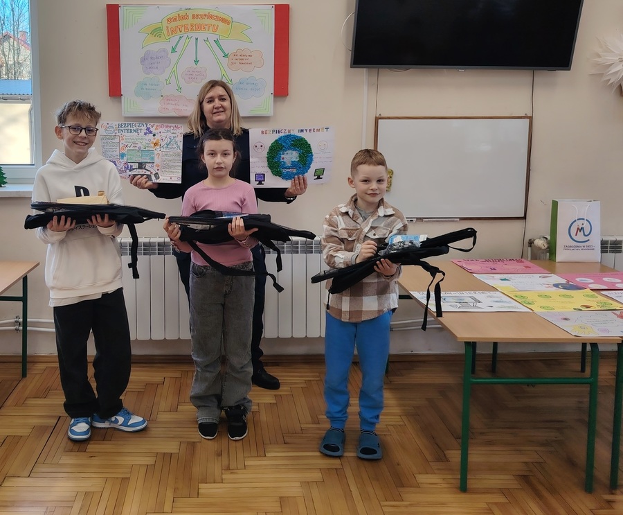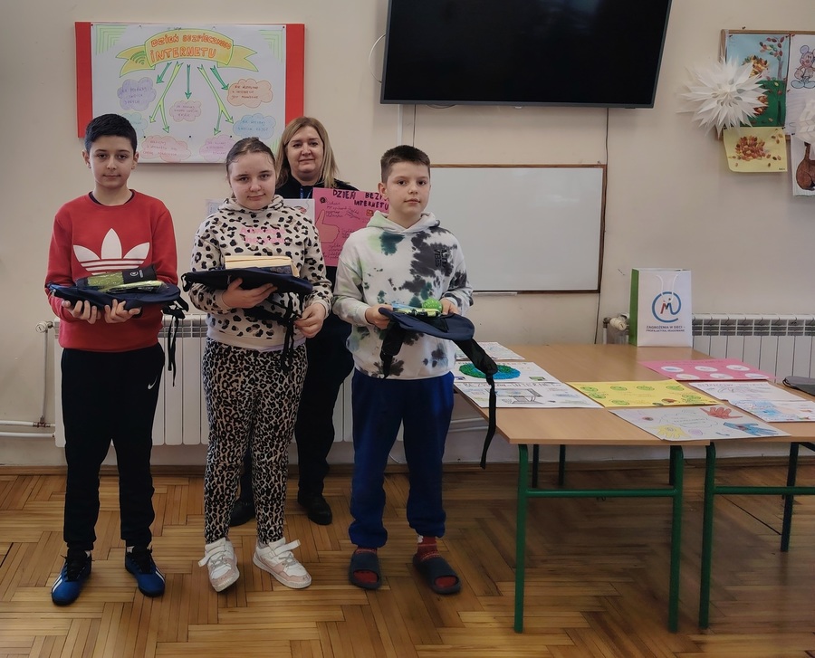 11 lutego br. w Wiejskim Domu Kultury w Przemykowie odbyło się wręczenie nagród w ramach ogłoszonego konkursu na temat zagrożeń internetowych. Na początku spotkania przeprowadzono pogadankę na temat odpowiedzialnego rozsądnego korzystania z Internetu, wirtualnej przestępczości, hejcie, kradzieży tożsamości, uzależnienia od Internetu. Podczas prelekcji mundurowi starali się uwrażliwić dzieci na potencjalne zagrożenia, z jakimi mogą się zetknąć podczas korzystania z licznych i cieszących się dużą popularnością portali społecznościowych. Ostrzegli przed lekkomyślnym zamieszczaniem w Internecie swoich zdjęć i danych osobowych, a także przed umawianiem się z obcymi. Po zakończeniu prelekcji funkcjonariusze proszowickiej Policji wraz z opiekunem grupy spośród wykonanych prac na temat Internetu wybrali najlepsze. Laureaci konkursu otrzymali atrakcyjne nagrody w ramach realizowanego od kilku lat programu profilaktycznego „Zagrożenie w sieci - profilaktyka, reagowanie”. Natomiast wszyscy uczestnicy, którzy wzięli udział w konkursie otrzymali nagrody pocieszenia.