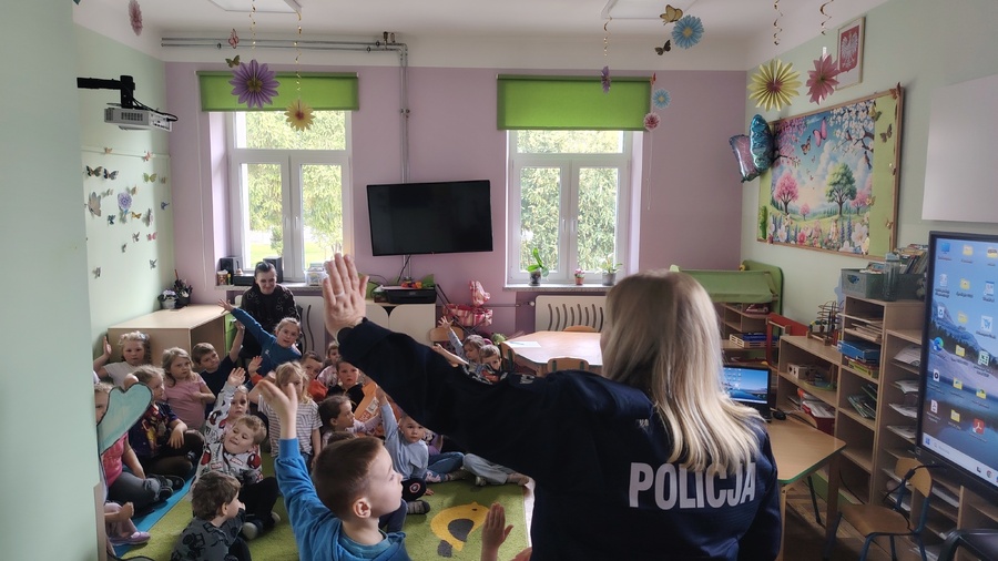 W dalszej części spotkania zaprezentowano sprzęt, który funkcjonariusze zabierają do codziennej służby. Przedszkolaki mogli zobaczyć i usiąść w policyjnym radiowozie oraz usłyszeć dźwięk sygnałów policyjnych. Spotkanie z policjantami cieszyło się dużym zainteresowaniem i przebiegło w miłej atmosferze.